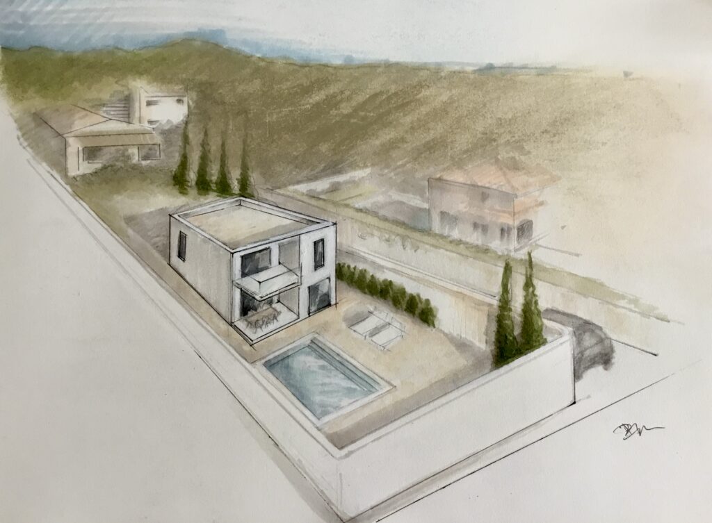 La imagen de renderizado incluida entre las fotografías es meramente ilustrativa y muestra una posible construcción que podría realizarse en la parcela, conforme a las normativas urbanísticas vigentes.